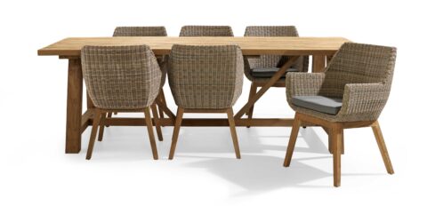 De natuurlijke uitstraling van tuinset Como is een perfecte match met de inrichting van jouw tuin. De set bestaat uit een tuintafel van massief teakhout met zes stoelen met een teakhouten frame en zitkuip van fijn gevlochten wicker. * Materiaal teakhout en wicker, kleur naturel * Met kussens in de kleur grijs * Tuintafel in 76 x 250 x 200 cm * Stoelen in H 85 x B 61 x D 67 cm * Dit zijn zelfmontage artikelen