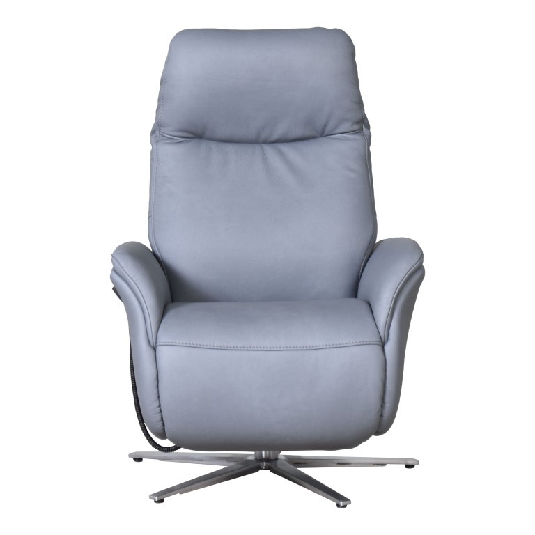 Relaxfauteuil Claudelle Blauw heeft een zachte uitstraling door de afgeronde hoeken en de zachte kleur. De stoel is makkelijk af te stellen door de 2-motorige relaxfunctie met accu. De voet is een stervoet met RVS-Optiek.
